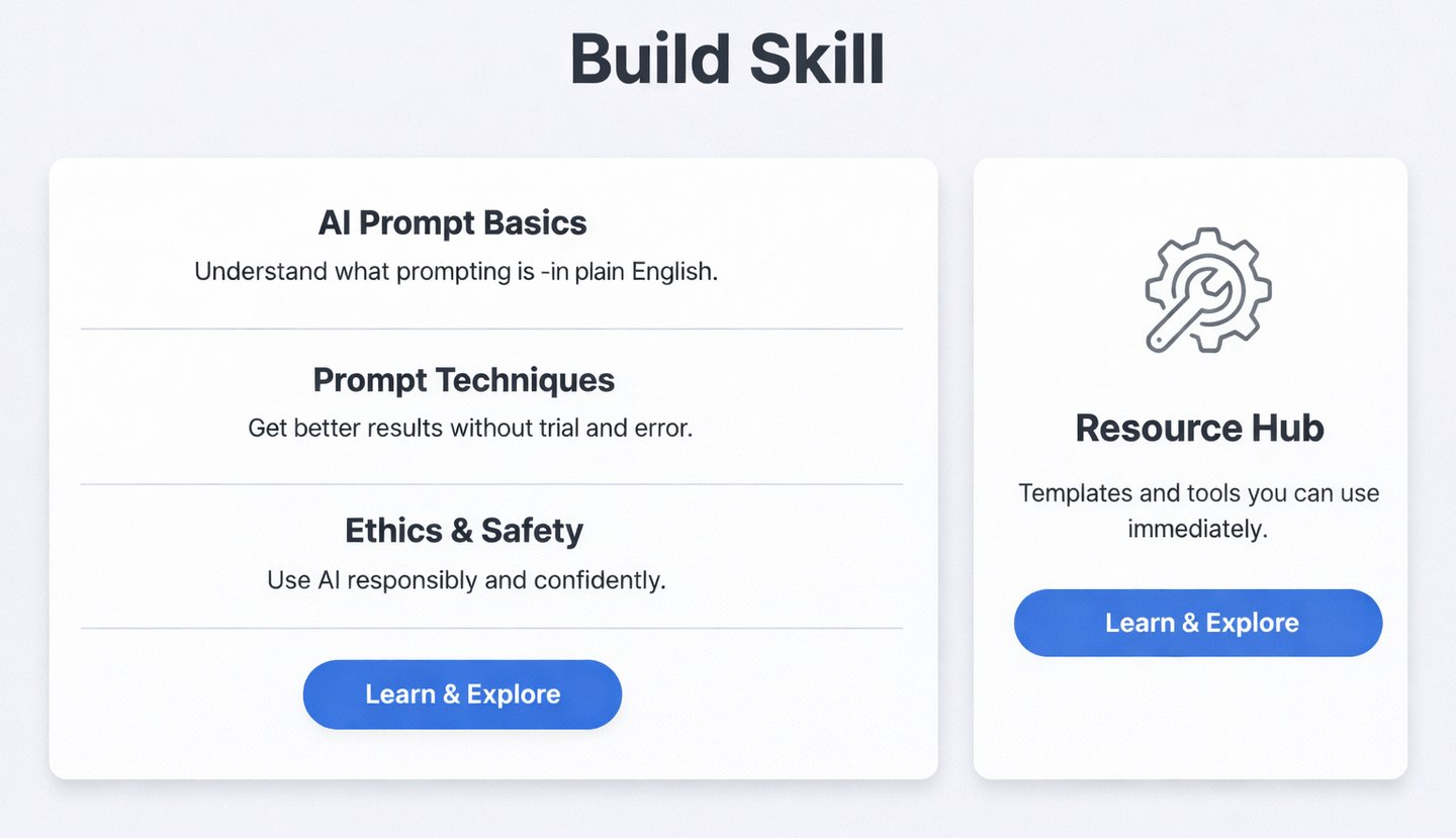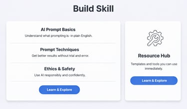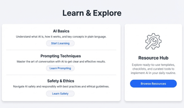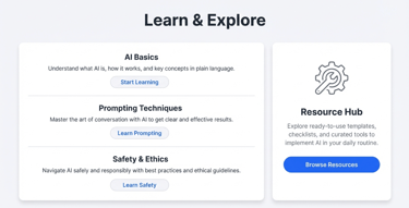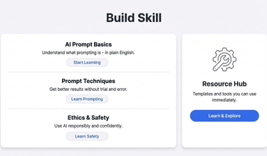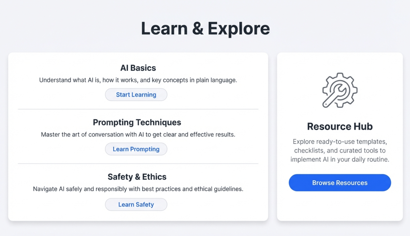 Not sure about digital basics? Plain-language fundamentals: what AI is, safety & ethics, prompting techniques, and glossary of terms.